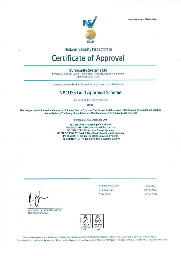 SV Security Systems boasts more than 26 years establishment in the security alarm systems marketplace. We are an NSI Nacoss Gold Approved Installer, which means we guarantee the highest quality installations and our after-sales service is second to none.